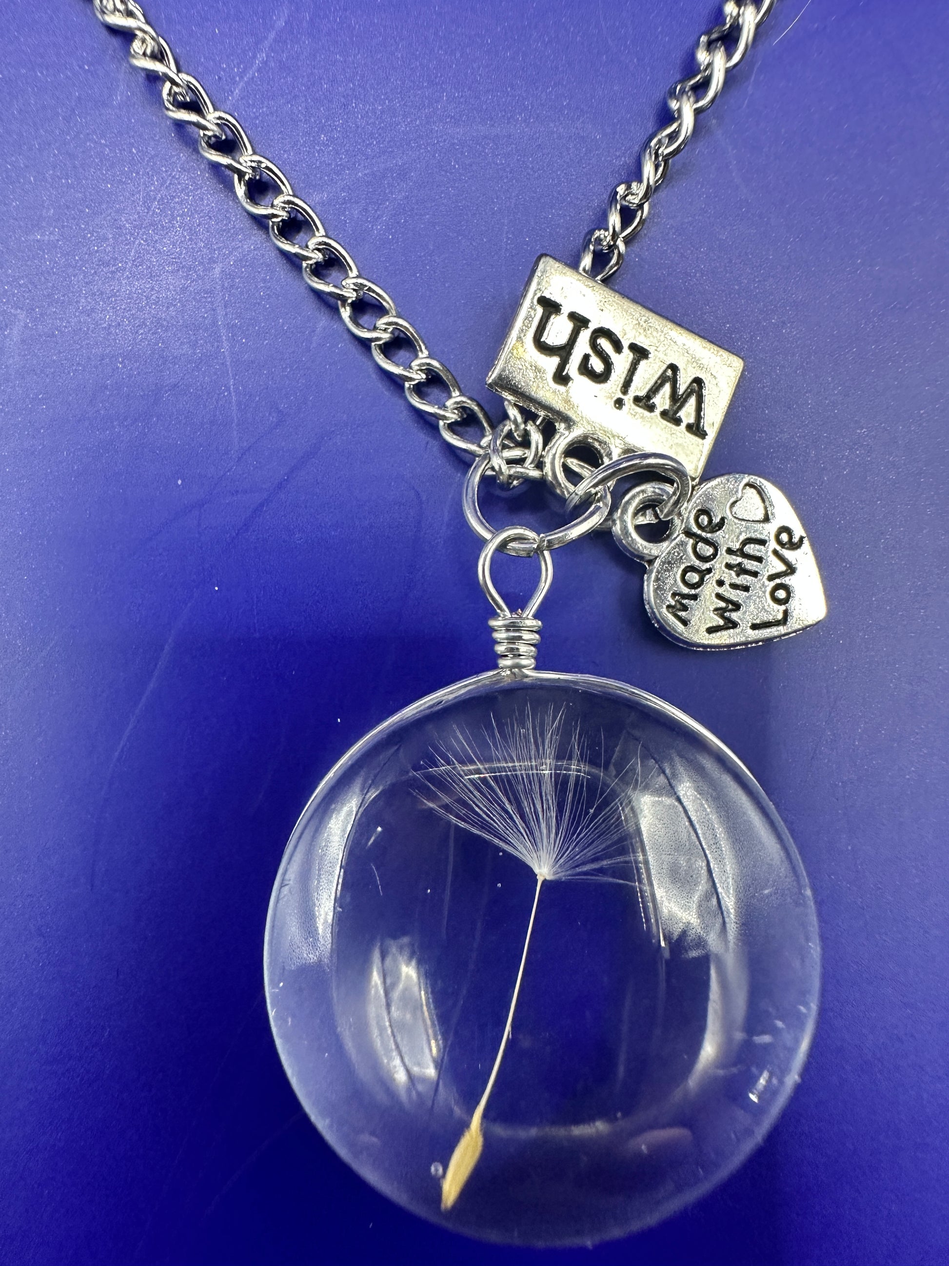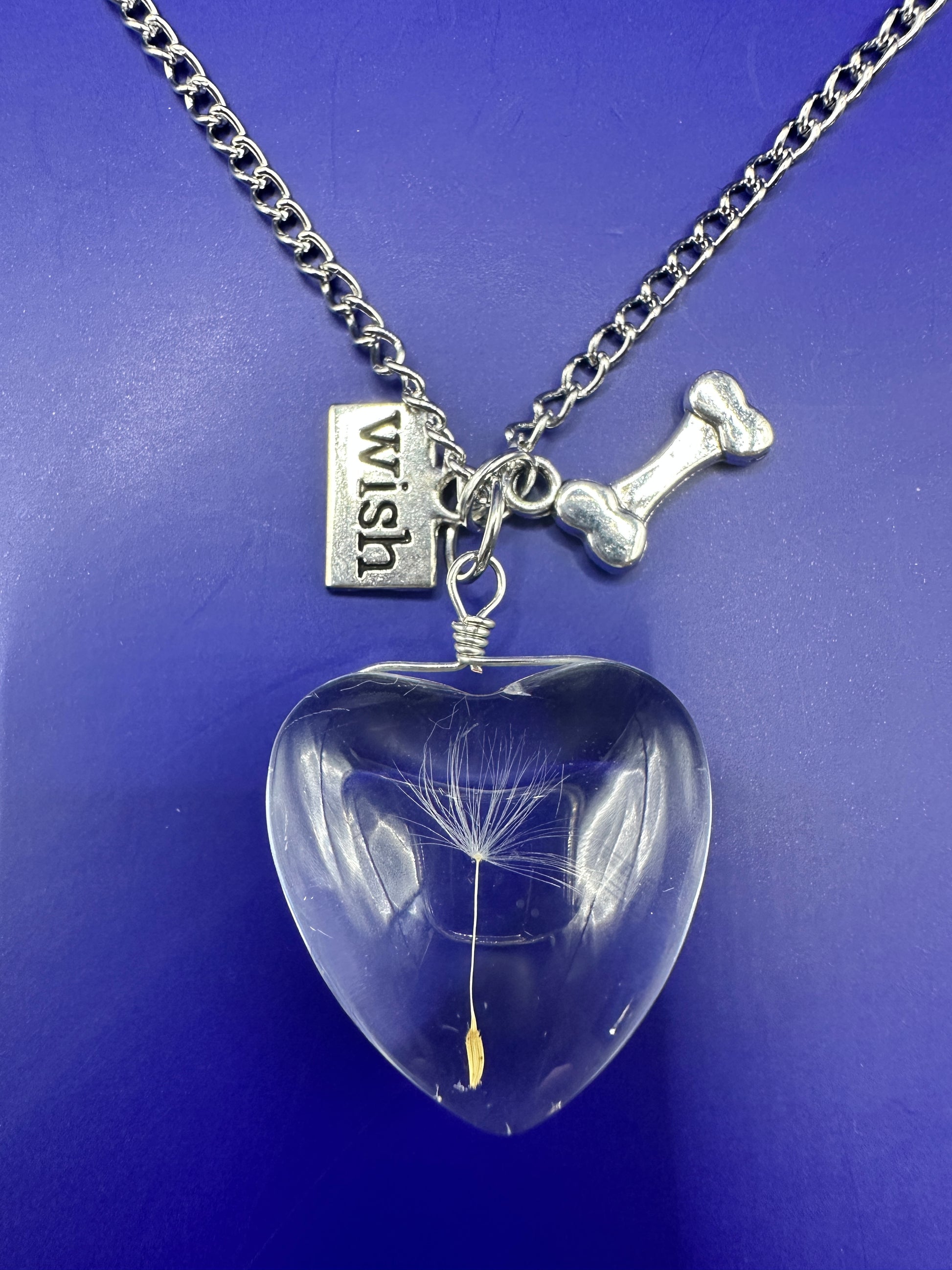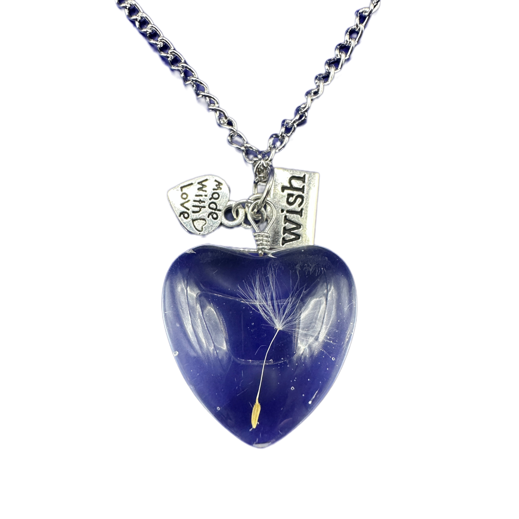Capture the delicate beauty of nature with our Dried Dandelions in clear Resin, with a Heart-shaped, or Round Ball Pendant, this also has charms attached to the Pendant completed with a stainless steel chain.