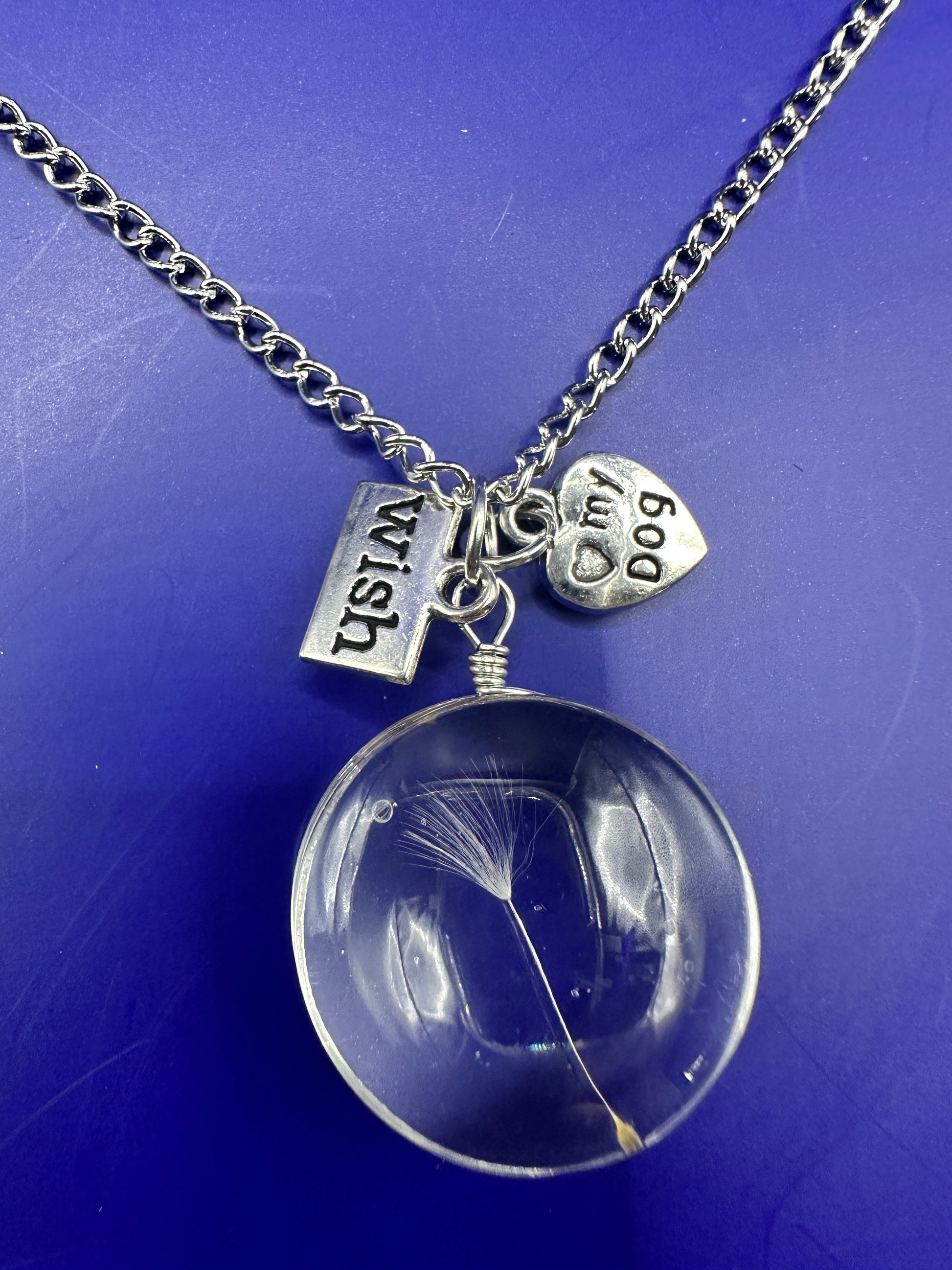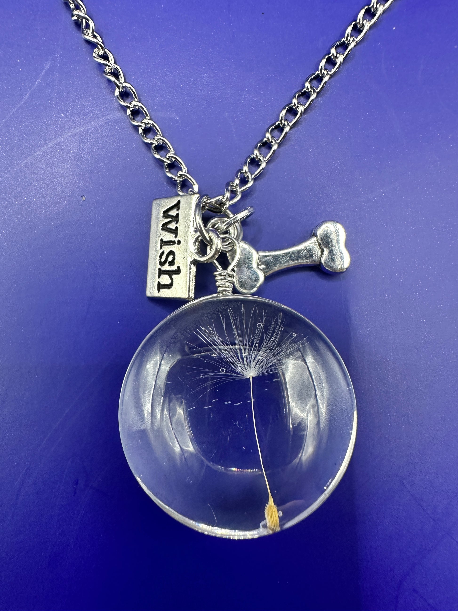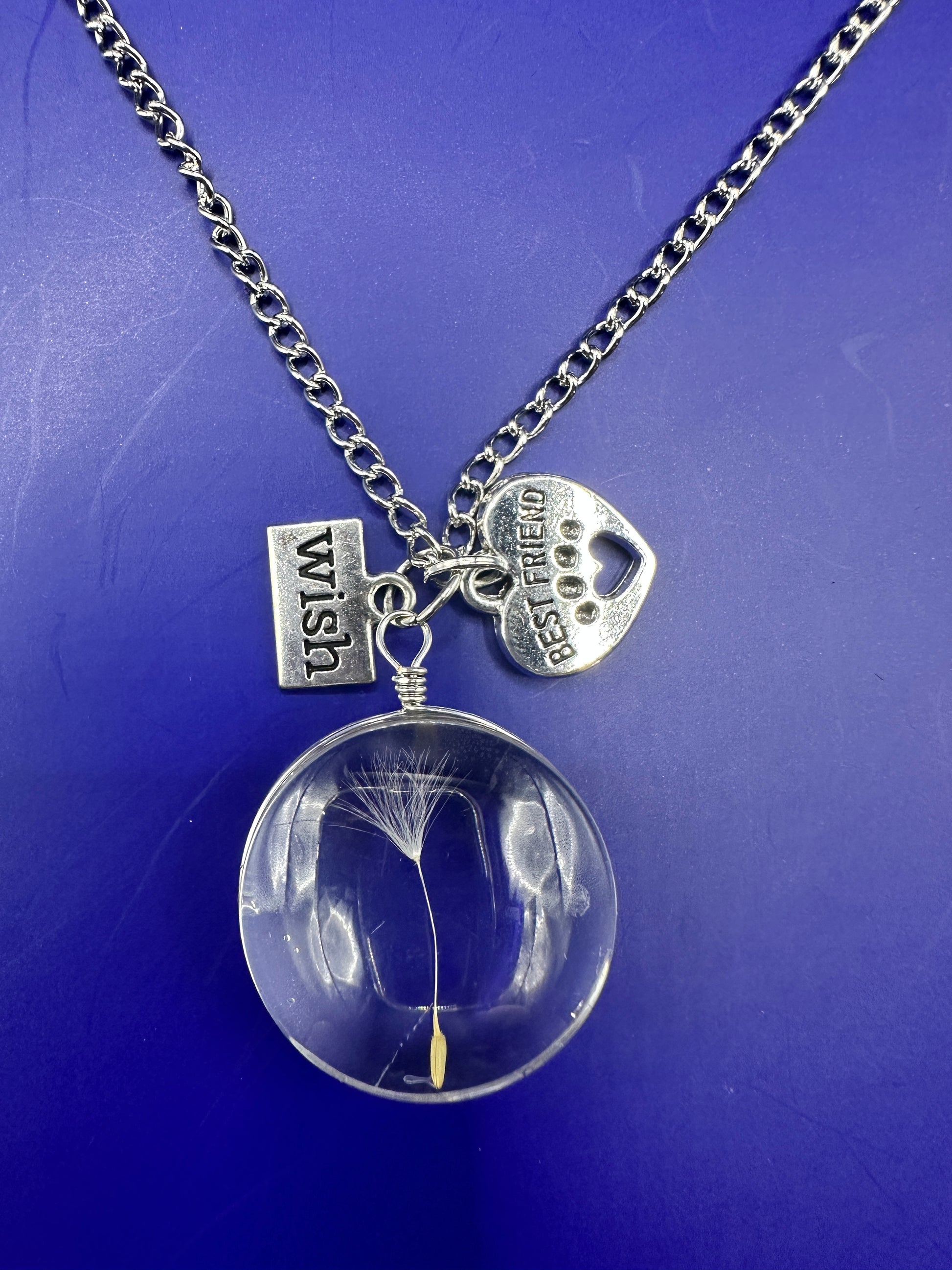 Capture the delicate beauty of nature with our Dried Dandelions in clear Resin, with a Heart-shaped, or Round Ball Pendant, this also has charms attached to the Pendant completed with a stainless steel chain.
